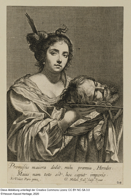 | Hist. Inhaltsverzeichnis: | 25. | Herodiade, qui porte la tête de S. Jean; au bas: Promissis majora dedit [...] | __ ,, __ [Si. Vouet pinx. C. Mellan sc.] |