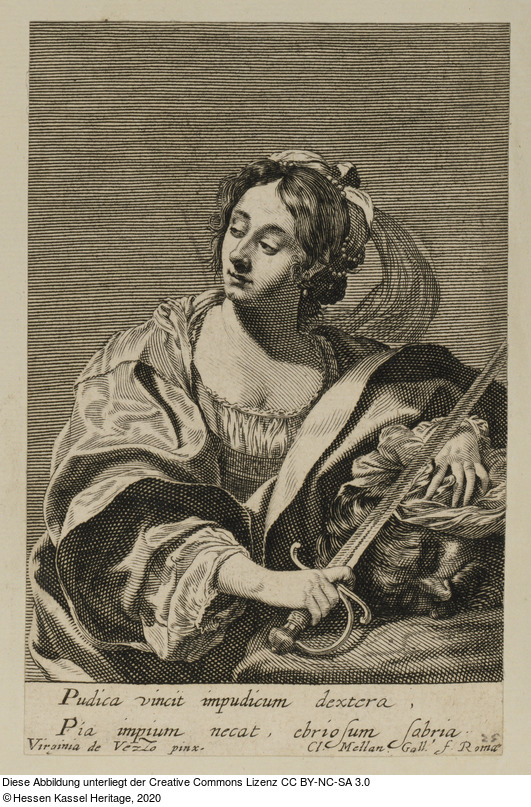 in der Platte: Pudica vincit impudicum dextera, Pía impium necat, ebrio sum sabria.;.Virginia de Vezzo pix.; Cl. Mellan Gall' f. Romae;