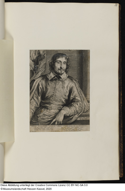 Beschriftungen: in der Platte: OBIIT XXI. MAY M. DC. XLI.; CAESAR ALEXANDER SCAGLIA ABBAS STAPHARDAE ET MANDANICES.; Hic, quem tacentem ... doctus ex uifis, parat.; P. Pontius sculp.; Ant. van Dyck pinxit; Pet. de Ioden scup.; Mart. vanden Enden excudit Cum priuilegio;