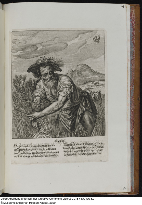 Sekundäre Ikonographie: 23I32 August; Ripa: Agosto Sekundäre Ikonographie: 23K32 der August und seine Arbeiten Primäre Ikonographie: 31D16 alter Mann Sekundäre Ikonographie: 92M18(SICKLE) Attribute der Ceres: Sichel Primäre Ikonographie: 47I141 ernten, pflücken, mähen Primäre Ikonographie: 47I111 Getreide, Korn (Graspflanzen mit Getreidekörnern, die zur Nahrungsmittelgewinnung angebaut werden, z.B. Weizen, Reis, Roggen, Hafer, Mais, Gerste, Hirse) Primäre Ikonographie: 47I142 zusammenbinden (Ernte) Primäre Ikonographie: 23O33 Virgo, Jungfrau (Tierkreiszeichen des August) Primäre Ikonographie: 47I123 pflügen |