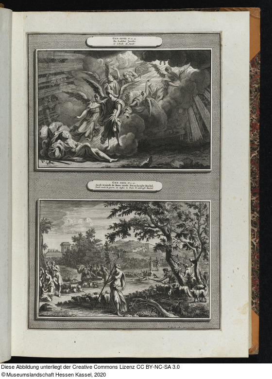 in der Platte: GEN. XXVIII. Vs. 12 .... 15. De Ladder Jacobs. L'Echelle de Jacob.; GEN. XXIX. Vs. 1 ... 10. Jacob wentelt de Steen vande Put en kryght Rachel. Jacob roule la pierre de dessus le Puits & embrasse Rachel.; 19; P. Mortier edit: Avec Privilege.;