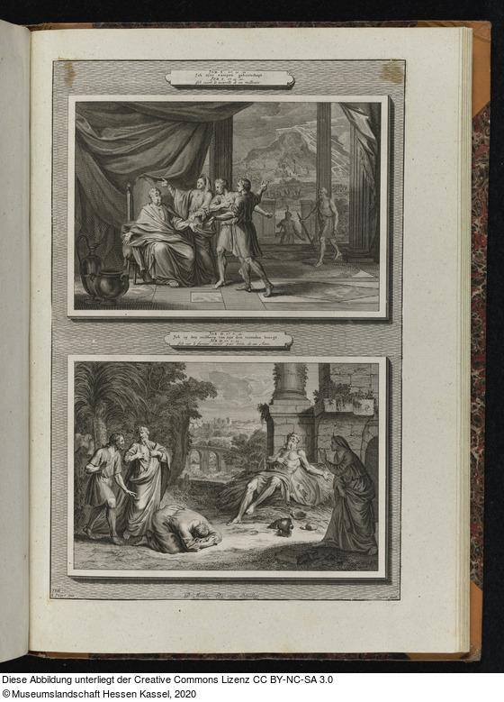 in der Platte: JOB. I. Vs. 13 ... 21. Job zijne rampen gebootschapt. JOB. I. Vs. 13 ... 21. Job recoit la nouvelle de ses malheurs.; JOB II. Vs. 7 .... 12. Job op den misthoop van zijn drie vrienden bezogt. JOB. II. Vs. 7 ... 12. Job sur le fumier visité par trois de se;