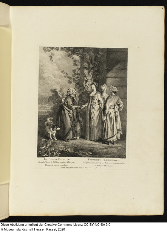 in der Platte: A. Watteau pinxit.; Cars Sculp.; LA DISEUSE DAVENTURE Gravée d'apres le Tableau original Peint par Watteau, de mesme grandeur; FUTURORUM PRAENUNTIATRIX Scalpta ... Depictum.; a Paris Chez F. Chereau graveur du Roy rue S.t Jacques aux deux pilliers d'Or.;