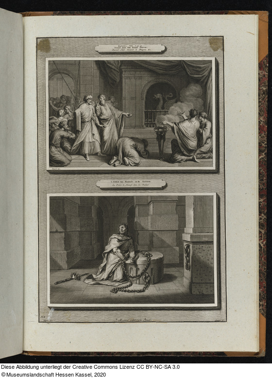 in der Platte: DANIEL XIV. Vs. 22 ... 26. Daniel doet den Draak sterven. Daniel fait mourir le Dragon &c.; Picard inv.; 't Gebed van Manasse in de Ketenen. La Priére de Manasse dans les Chaînes.; 134; Elliger inv.; P. Mortier edit: cum Privil.; Gouwen fec.;