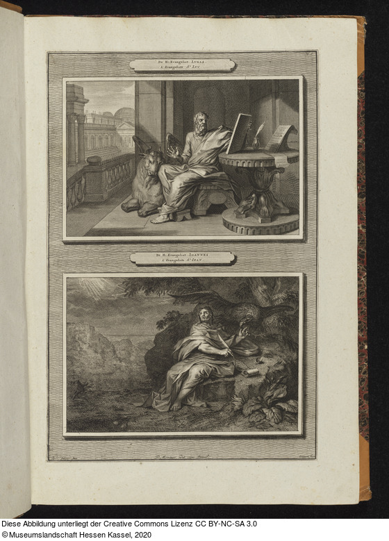 in der Platte: Pag. 3.; De H: Evangelist LUKAS. L'Evangeliste St. LUC; De H: Evangelist IOANNES. L'Evangeliste St. IEAN; 2; Elliger Jnv.; P. Mortier edit cum Privil.; Gouwen fecit;