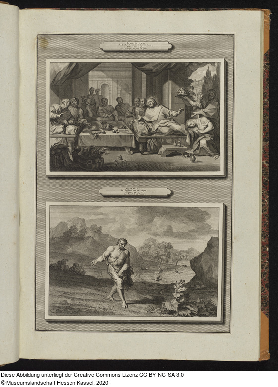 in der Platte: Pag. 43.; LUKAS. VII Vs. 36 .. 38. de Zondaresse aan de voeten van Iesus. St. LUC. VII Vs. 36 .. 38. La Pécheresse aux pieds de Jésus.; MATTH. XIII Vs. 3 ... 8. De Gelykenis van den Zaayer. St. MATT. XIII Vs. 3 .. 8. La Parabole du Semeur.; 22; Elliger jn;