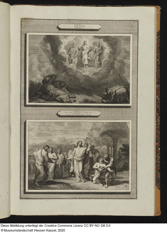 Beschriftungen: in der Platte: Pag. 51.; MATTH. XVII. Vs. 1 .. 7. De Gedaantverandering. St. MATT. XVII. Vs. 1 .. 7. La Transfiguration.; MATTH. XVII. Vs. 14 .. 18. Christus geneest een Maanziek en Bezeten Kindt. St. MATT. XVII. Vs. 14 .. 18. Jésus Christ guérit un enfant Lunatique, &;