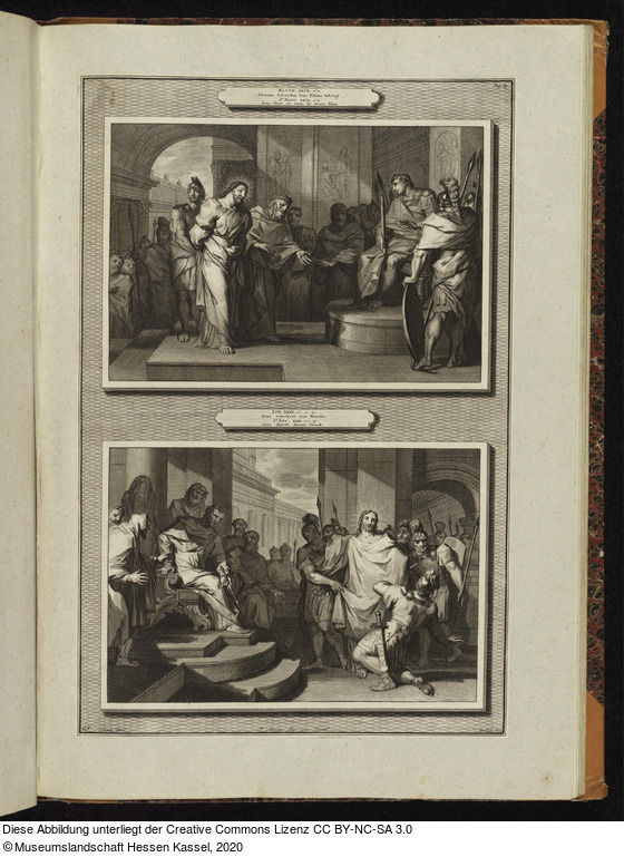| in der Platte: | Matth. XXVII. Vs. 2. Christus Gebonden voor Pilatus Gebragt. St. Matt. XXVII. Vs. 2. Iésus-Christ est mené lié devant Pilate |