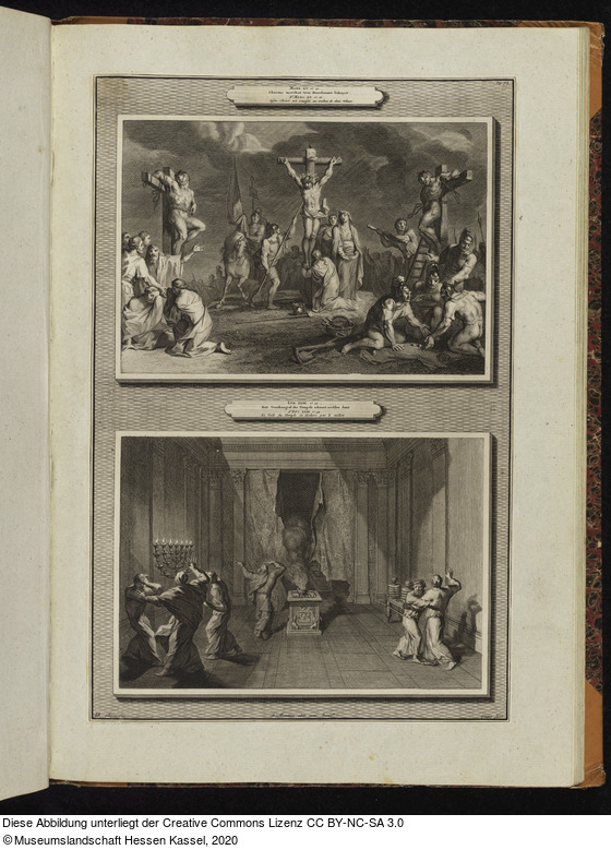in der Platte: Pag. 97.; MARK. XV. Vs. 27 .... Christus tusschen twee Moordenaars Gekruyst. St. MARC. XV. Vs. 27 ... Iésus-Christ est Crucifié au milieu de deux Voleurs.; LUK. XXIII. Vs. 45 ... Het Voorhangsel des Tempels scheurt midden door. St. LUC. XXIII. Vs. 45 ...;