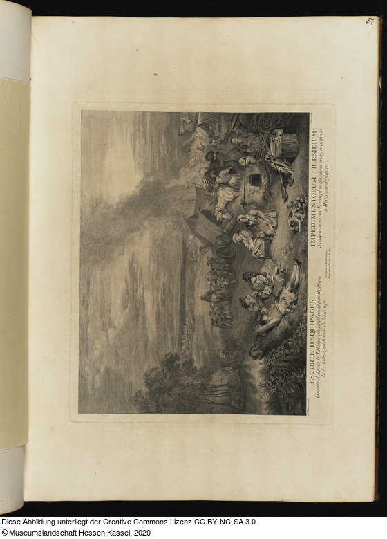 Beschriftungen: in der Platte: A Watteau pinxit; Cars Sculp.; ESCORTE DEQUIPAGES; IMPEDIMENTORUM PRAESIDIUM; d'Apres le Tableau original peint par Watteau de la même grandeur de l'estampe.; Scalptum ... depictum.; du Cabinet de Mr de Jullienne a Paris Avec Privilège du Roy;