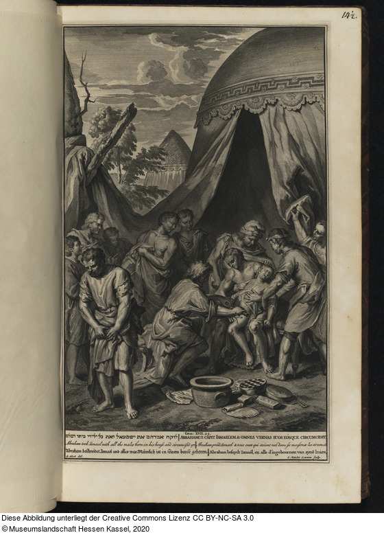 in der Platte: Gen: XVII. 23. ... Abraham beschneidet Ismael und alles was Männlich ist in seinem hause geboren ... von zyne huize.; G. Hoet del:; G. Vander Gouwen sculp.;